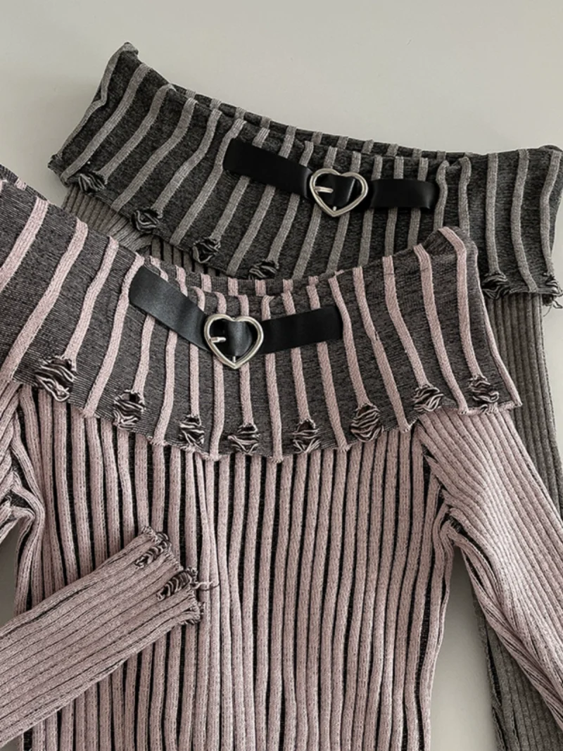 个性小众坑条翻边一字领套头毛衣女2024冬季新款韩版气质毛针织衫