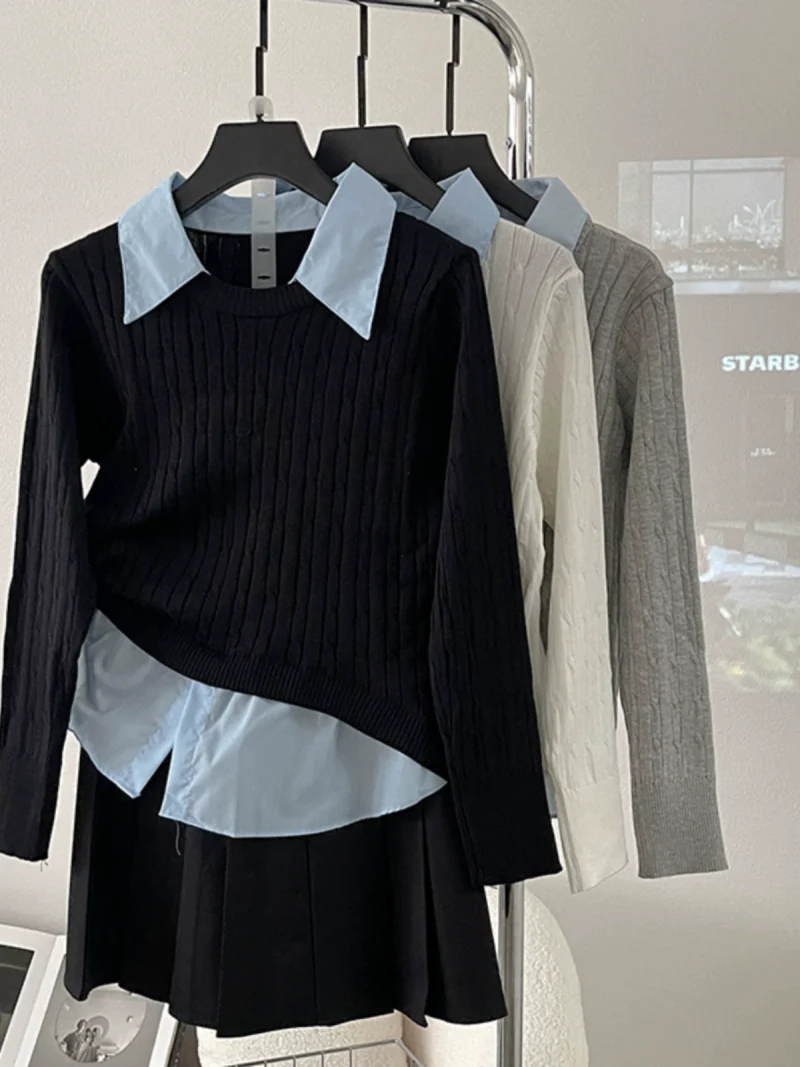 Be the first to review “休闲个性撞色假两件长袖针织衫2024秋季新款韩版女装翻领宽松上衣”