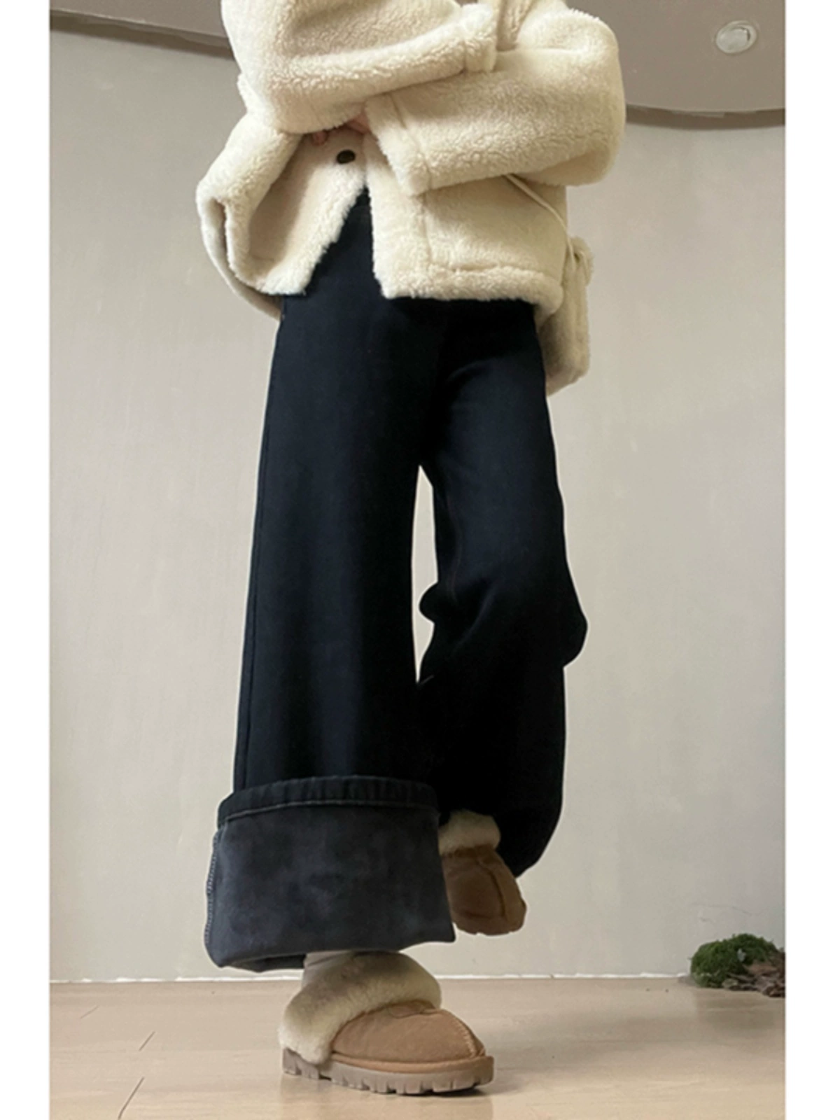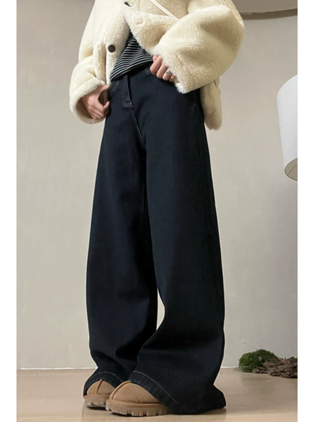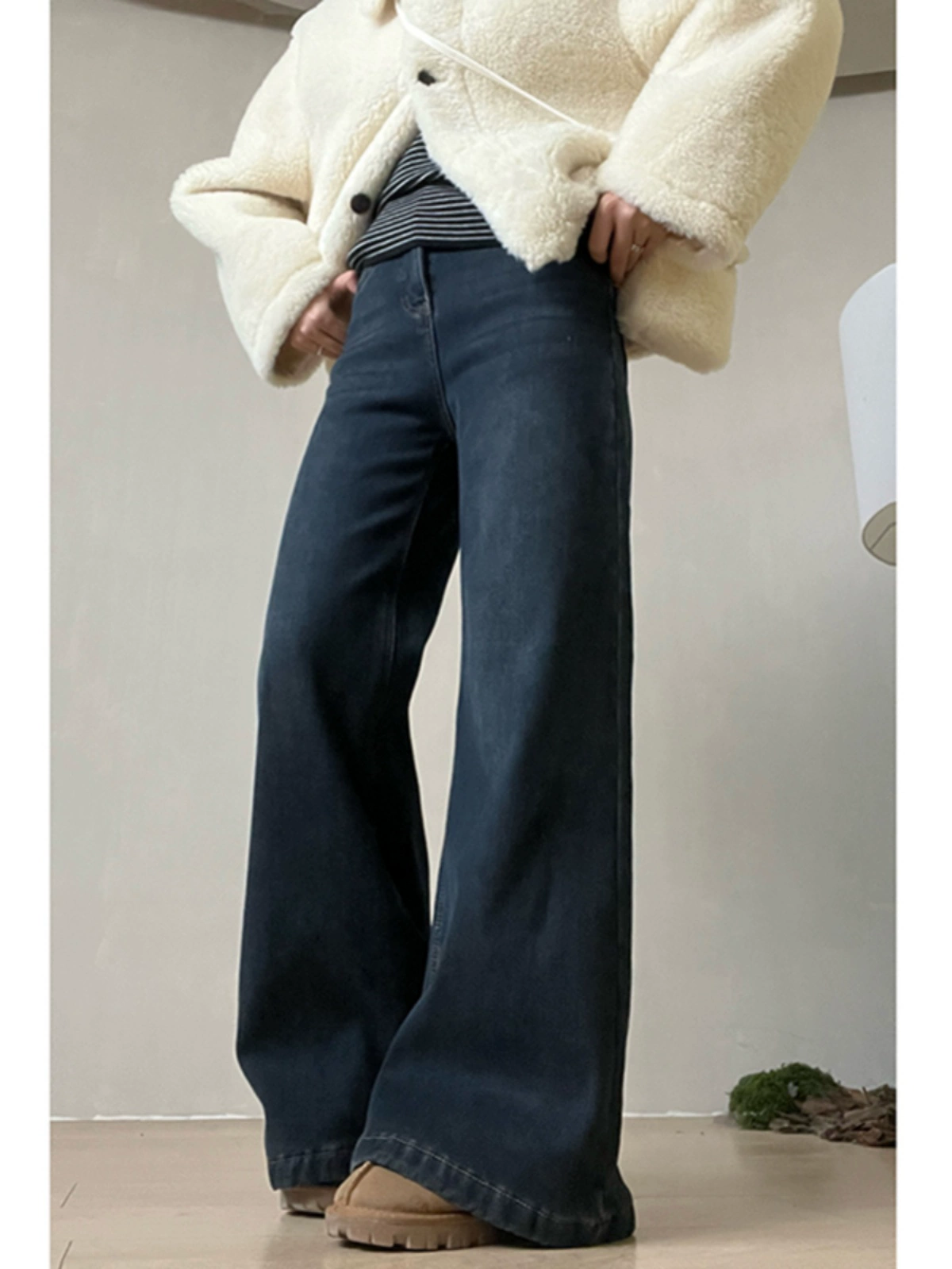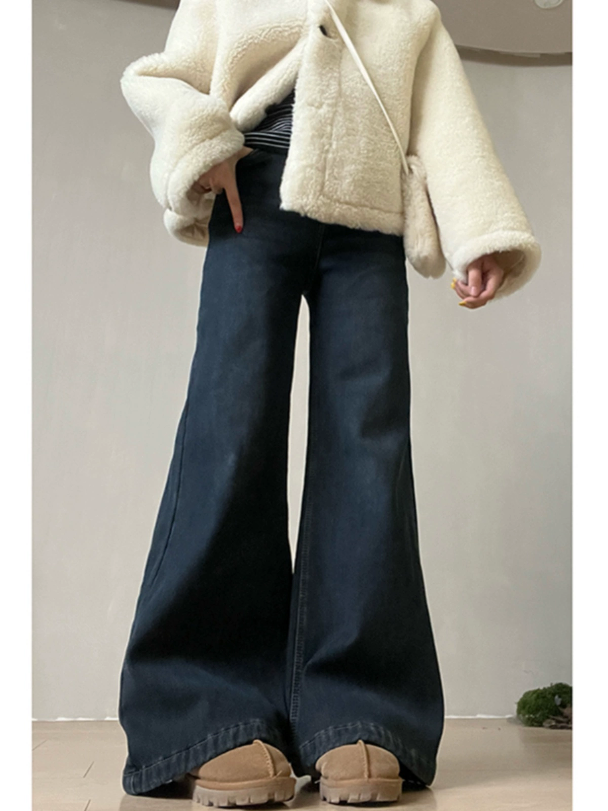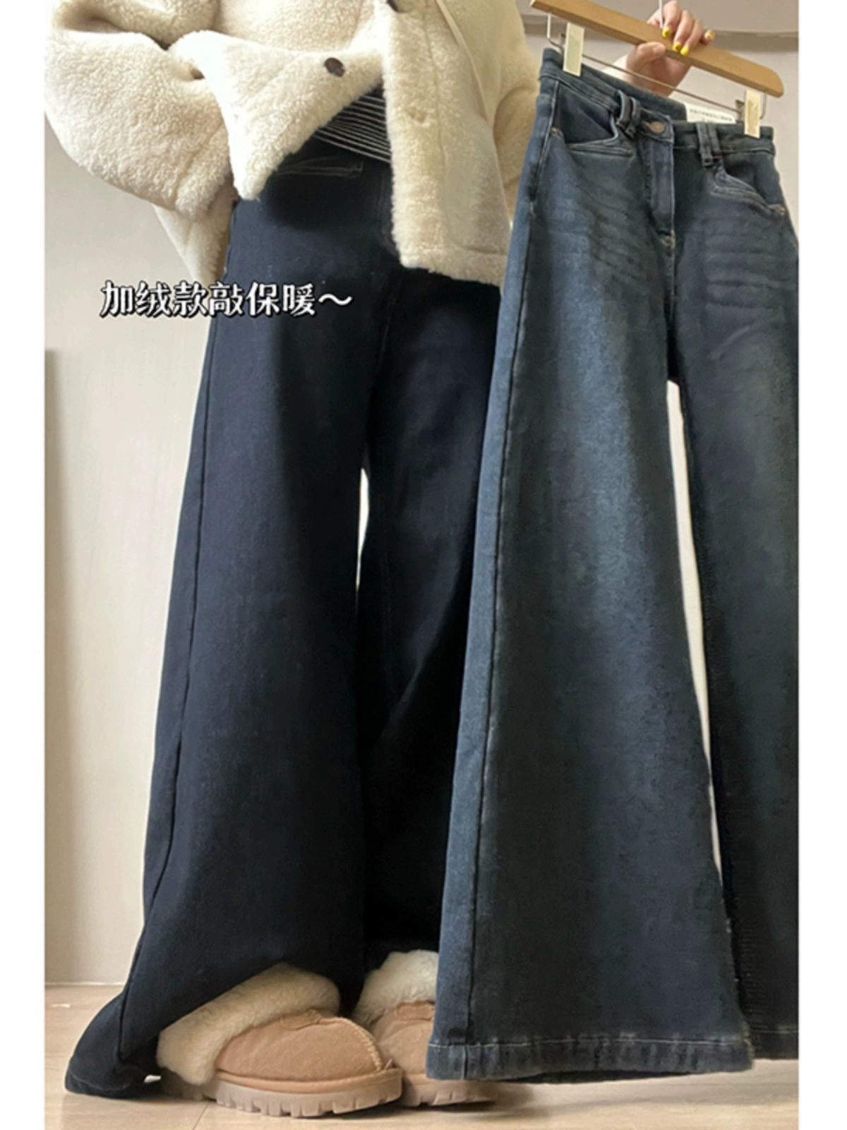加绒加厚高腰复古牛仔裤女装2024冬季新款韩宽松拖地微喇阔腿长裤