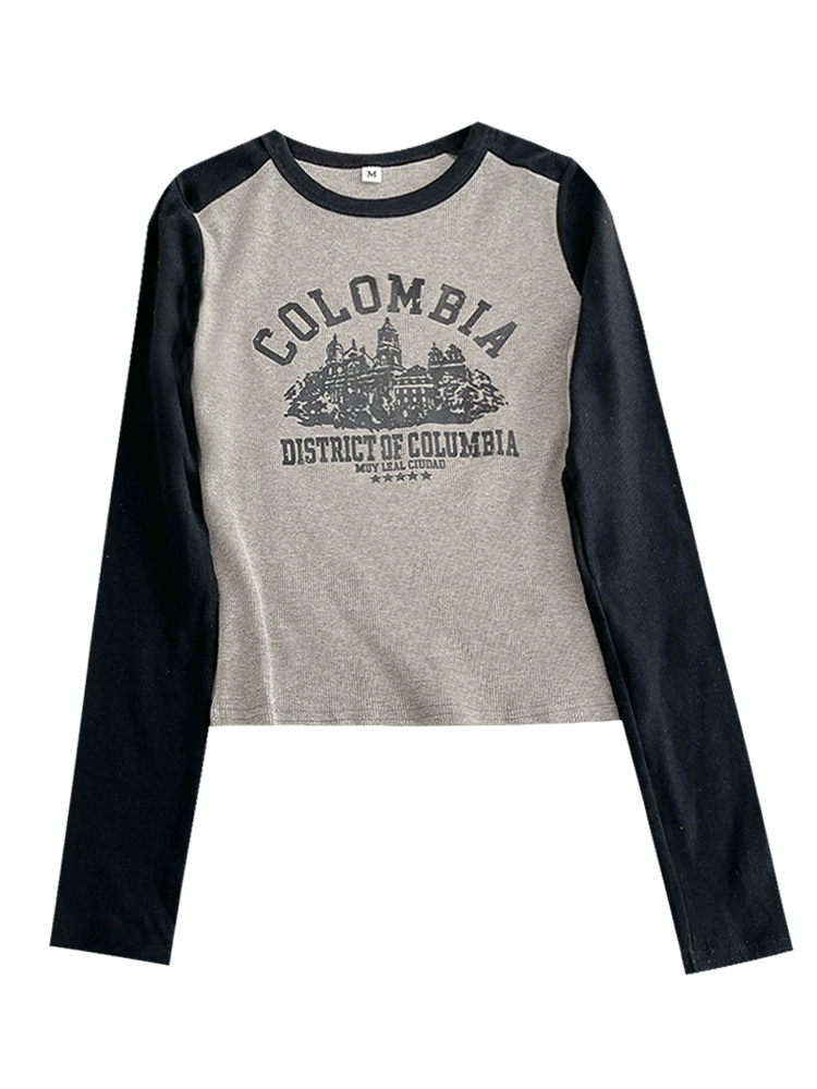 撞色插肩字母印花T恤2024秋季新款女长袖简约套头洋气长袖上衣潮