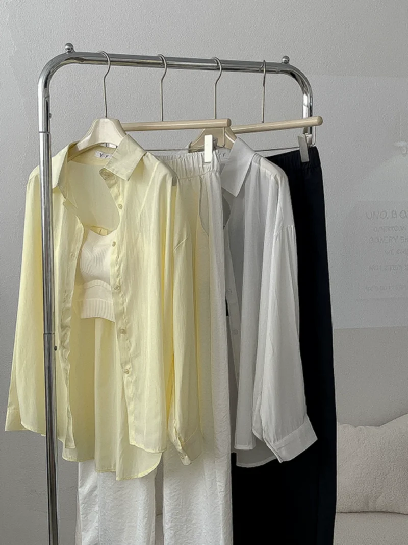 时尚纯色翻领长袖防晒衬衫2024夏季新款韩版女吊带背心垂感休闲裤