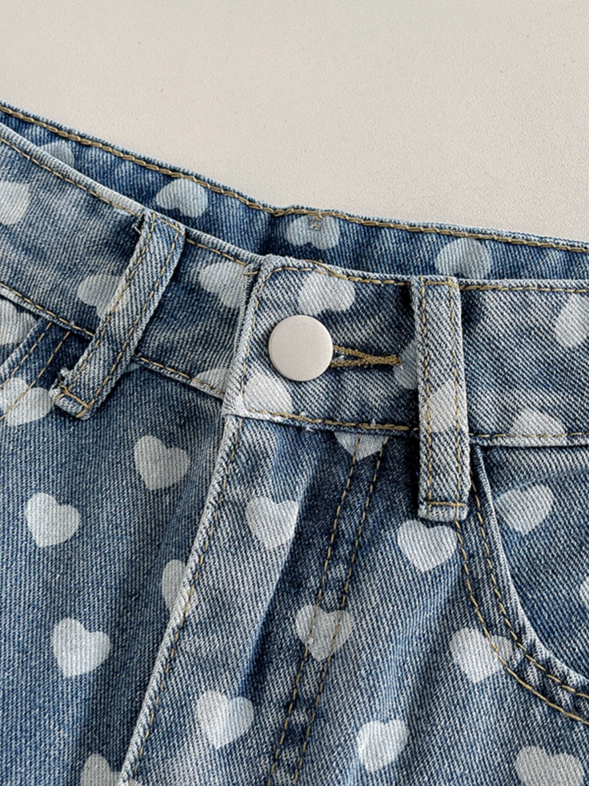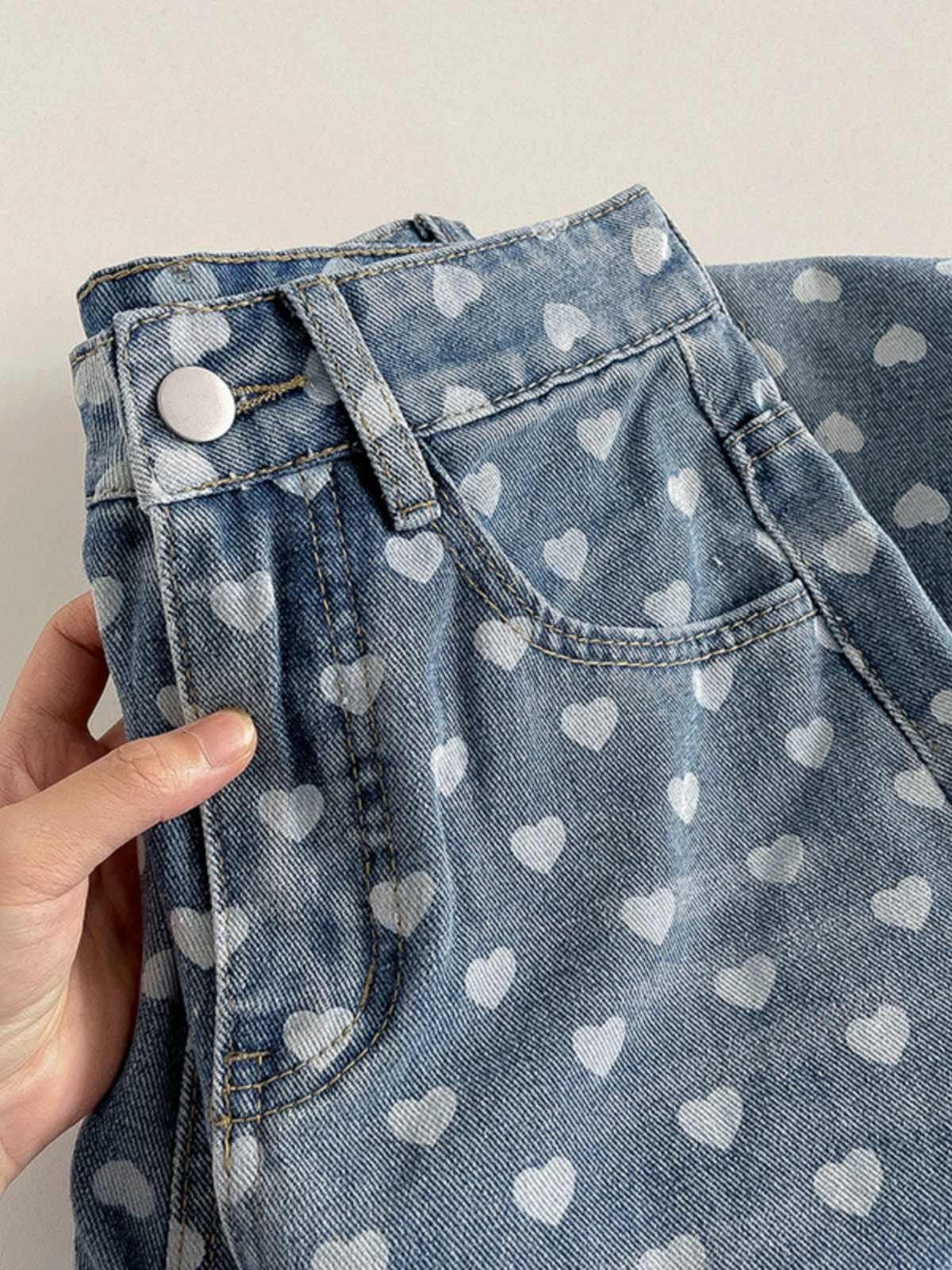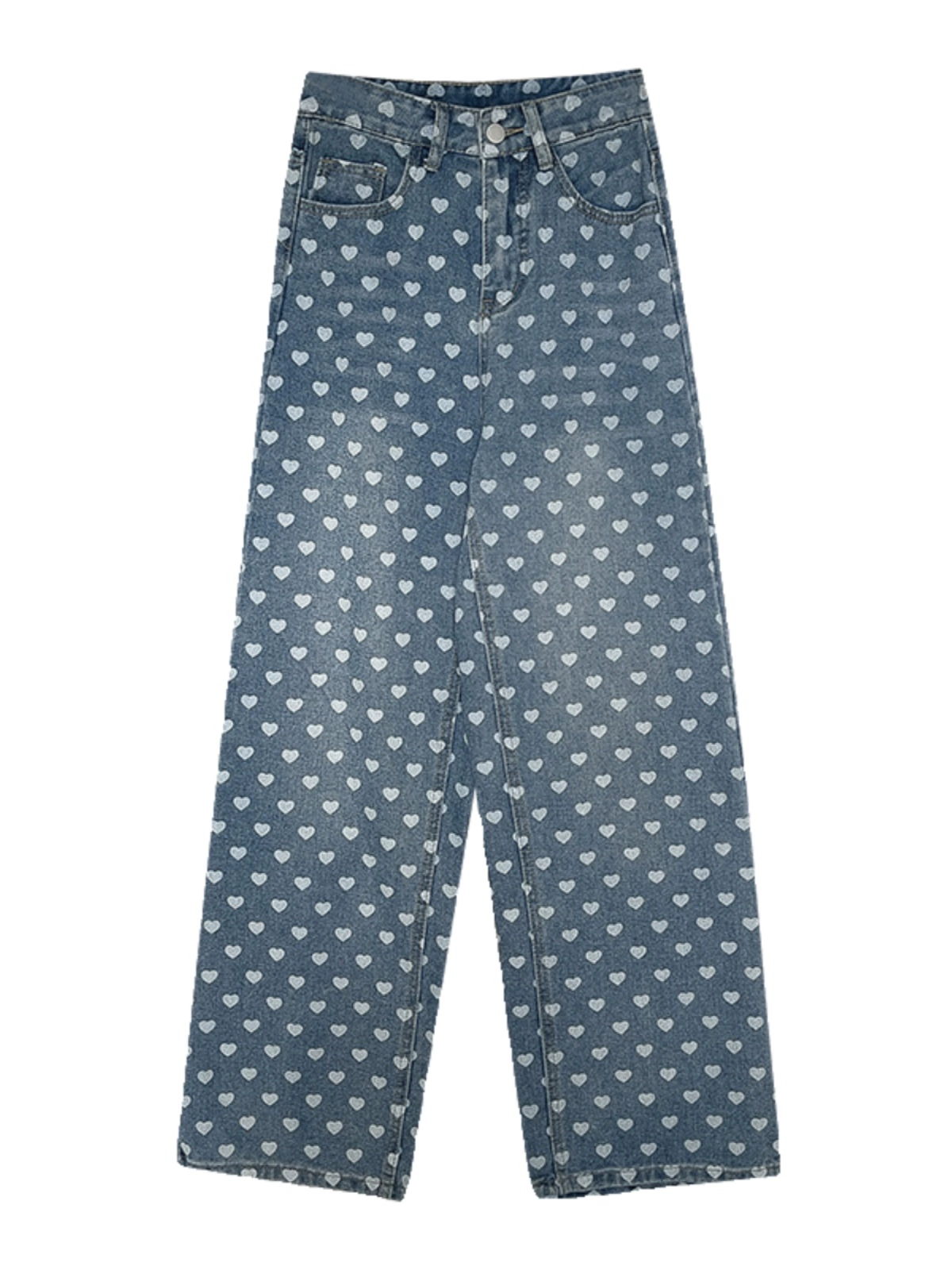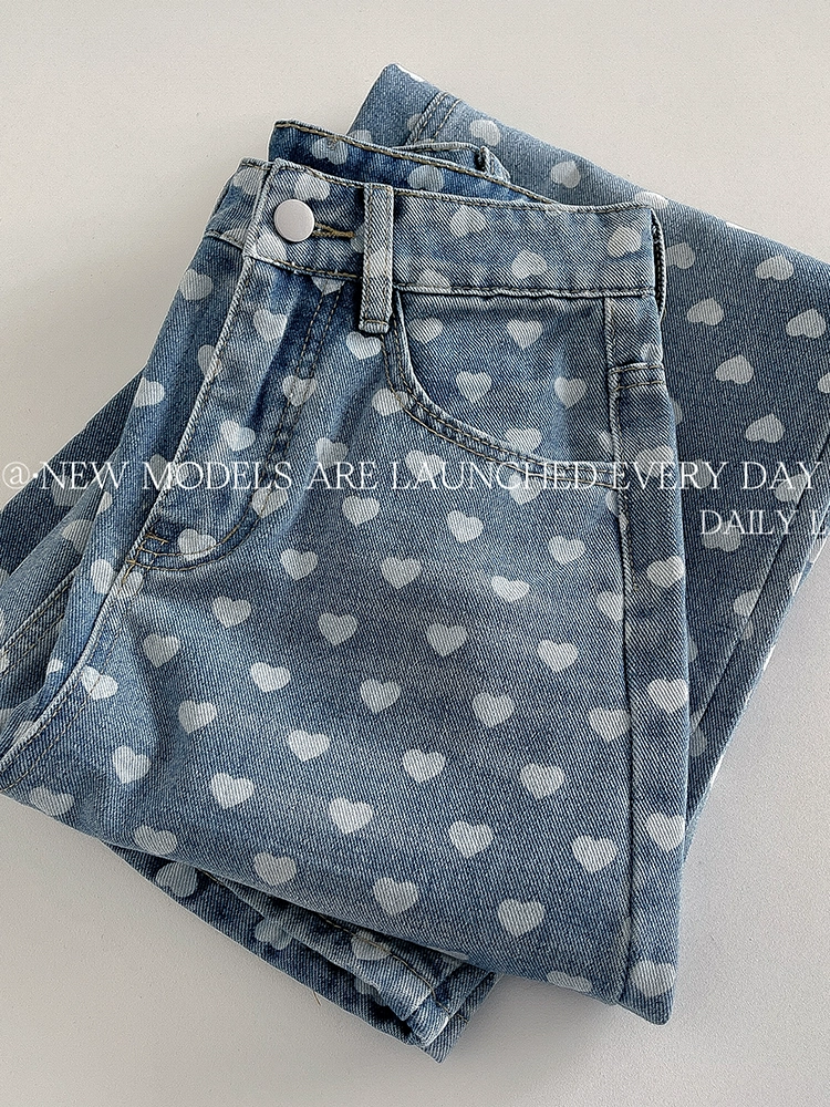 满印爱心牛仔裤女2024春秋新款韩版宽松显瘦百搭时尚休闲直筒长裤