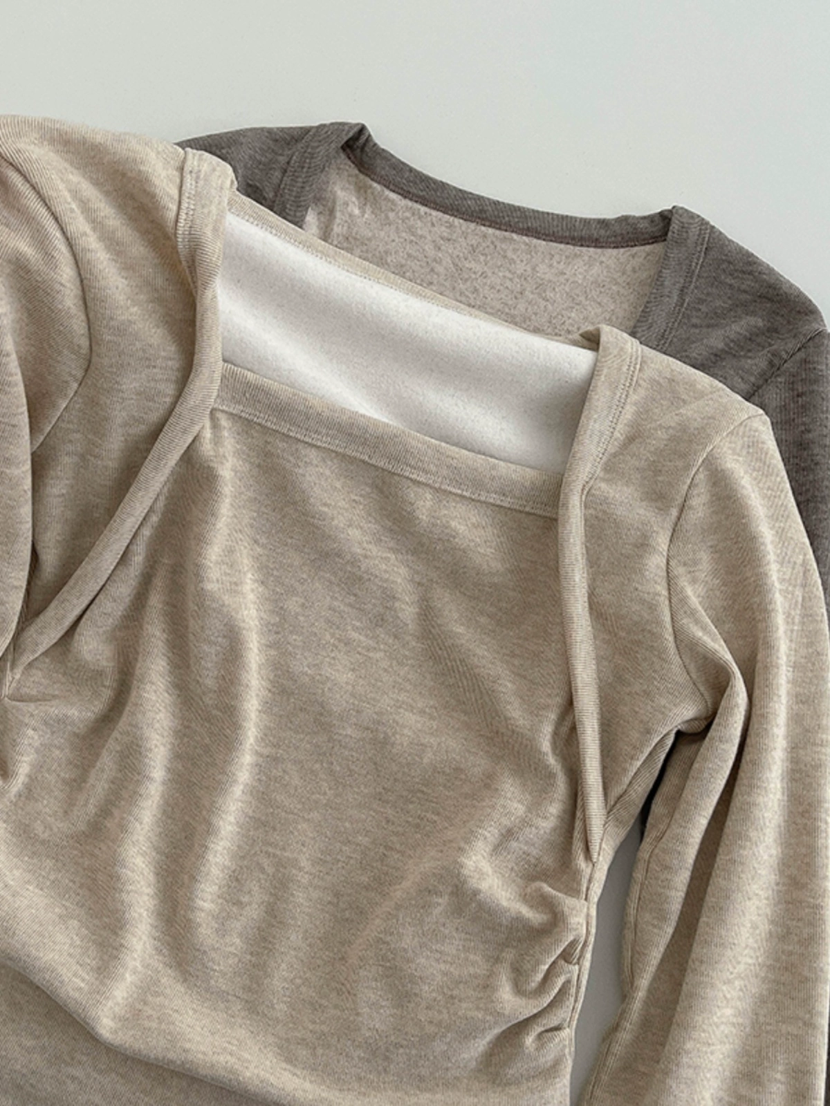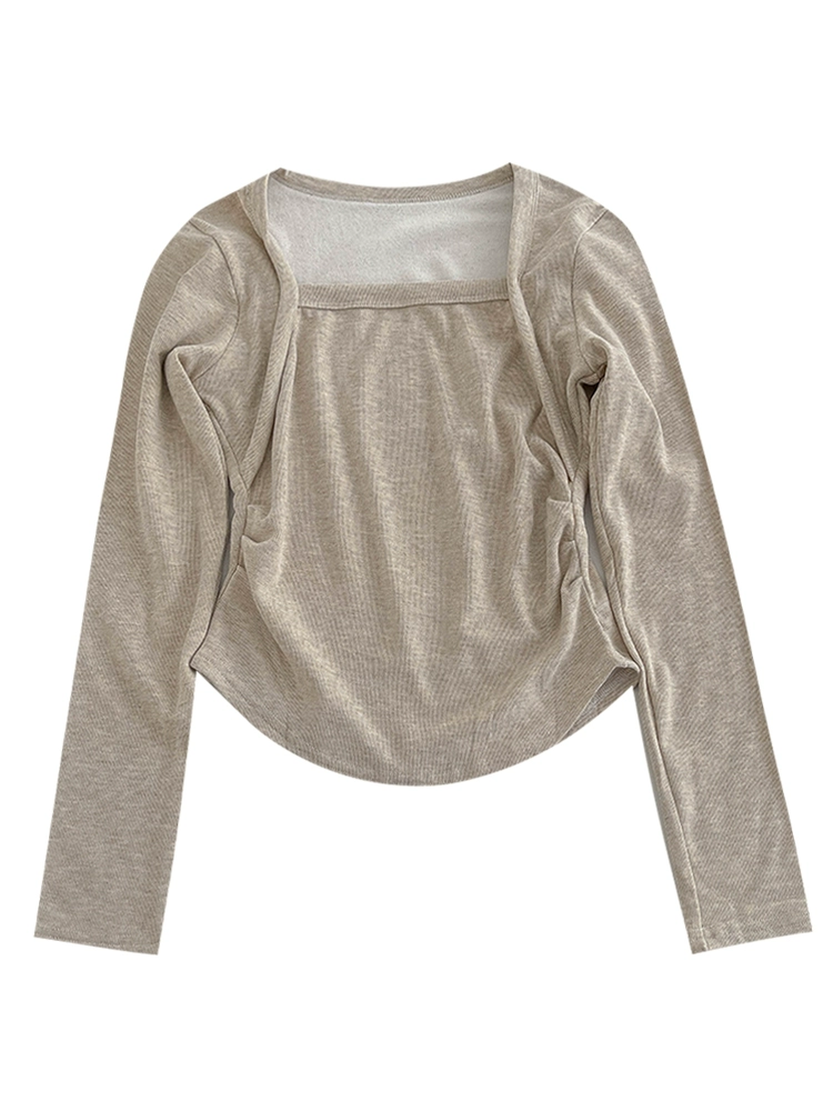 简约纯色方领拼接 T恤2024秋季新款女长袖简约套头洋气长袖上衣潮