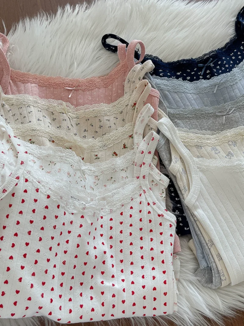 纯欲蕾丝花朵蝴蝶结印花小吊带2024冬季新款女装内搭修身短款上衣