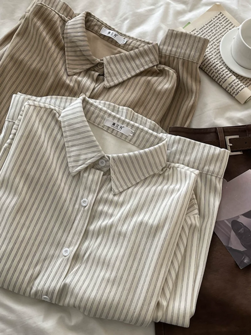 Be the first to review “2024秋新款长袖条纹咖色衬衫女时尚休闲设计感小众单排扣盐系上衣”