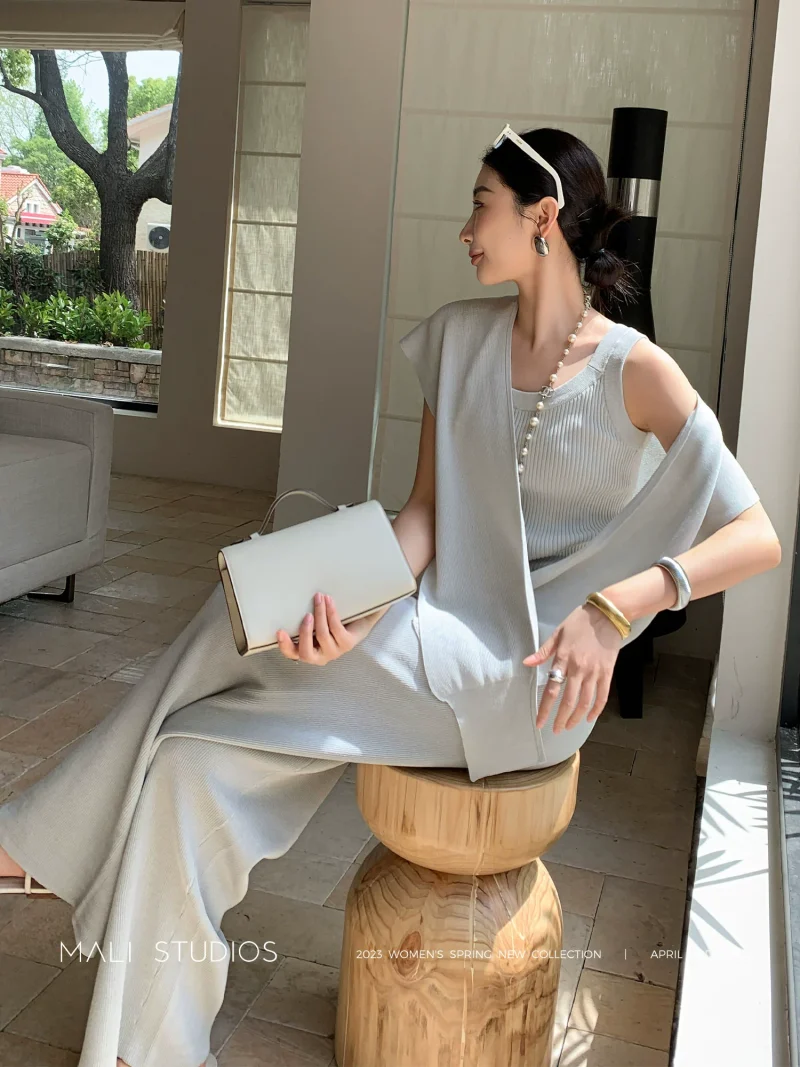 MALI|及简气质风_纸片人显瘦针织造型披肩&背心&长裤三件套