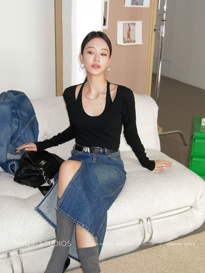 MALI|双层解构设计_强捻全棉针织微透假两件修身T恤