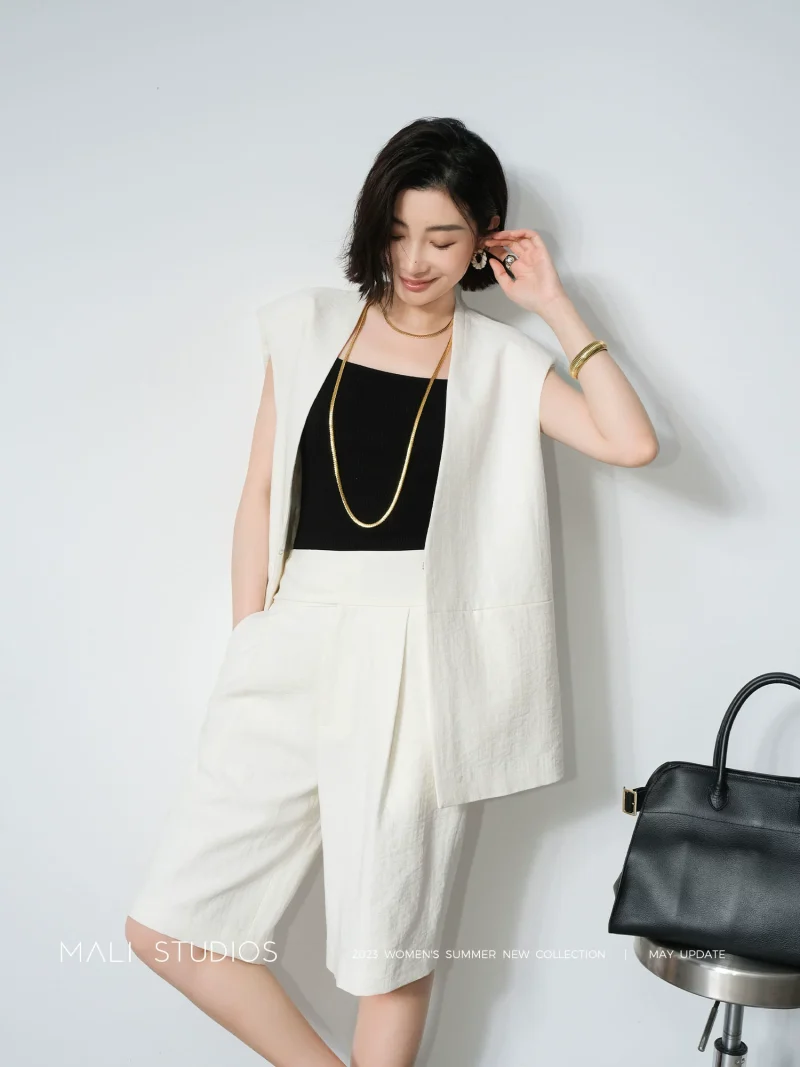 MALI|定制Viscose天然亚麻混纺_及简无领大廓形马甲宽腰封五分裤