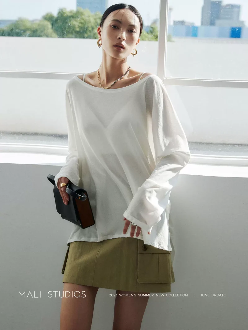 MALI|定纺轻薄强捻纱_超百搭一字领宽松舒适长袖防晒T恤