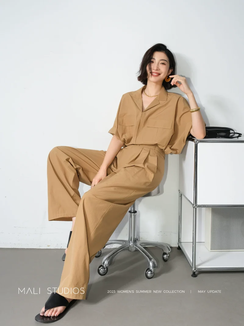 MALI|工装风纸片人套装_夏季宽松蝙蝠袖短袖衬衫+腰带休闲裤