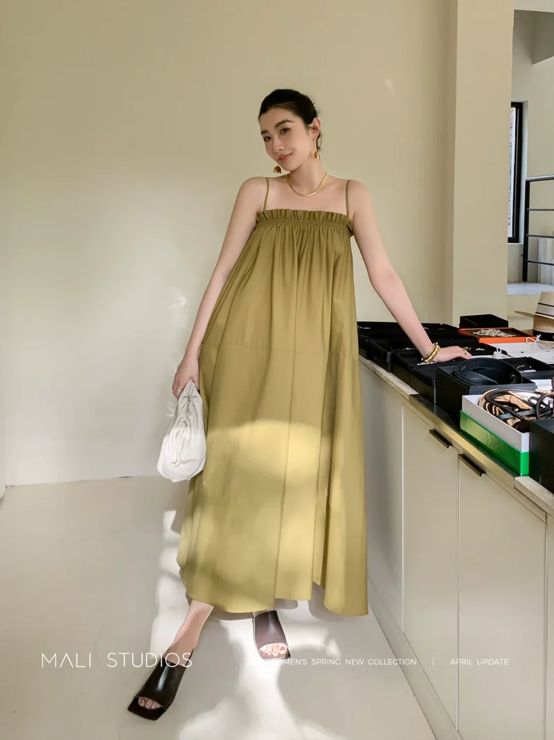 MALI|度假氛围感_夏季褶皱抹胸A字吊带连衣裙