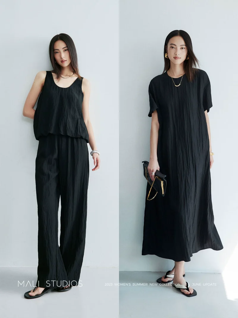 MALI|微皱肌理感面料_清凉舒适極简泡泡无袖背心空气裤连衣裙