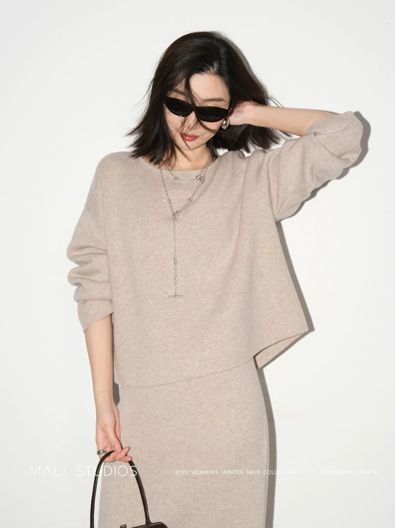 MALI|时髦羊绒羊毛套装_弧袖廓形毛衣+直筒针织半裙