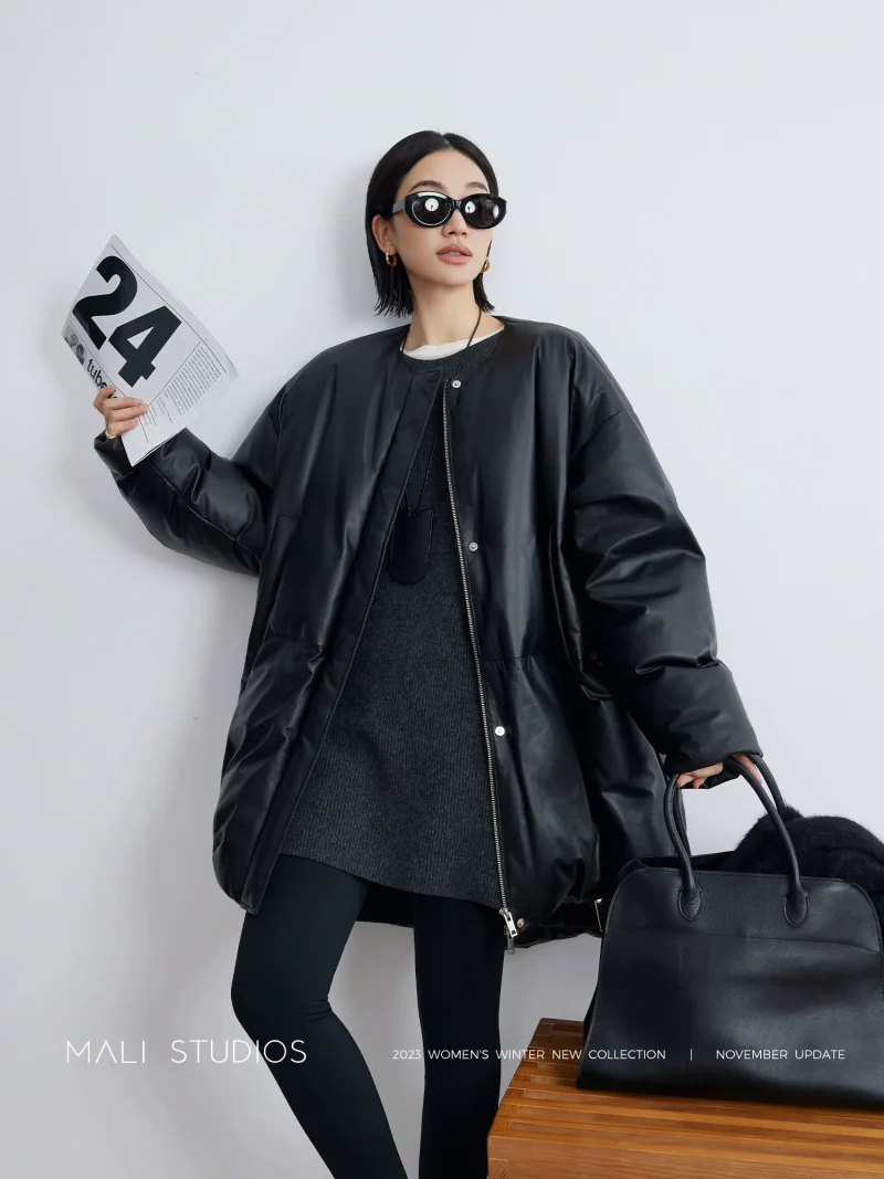 MALI|轻涂层绵羊皮90白鸭绒_北欧风立体茧型大廓形皮羽绒长外套