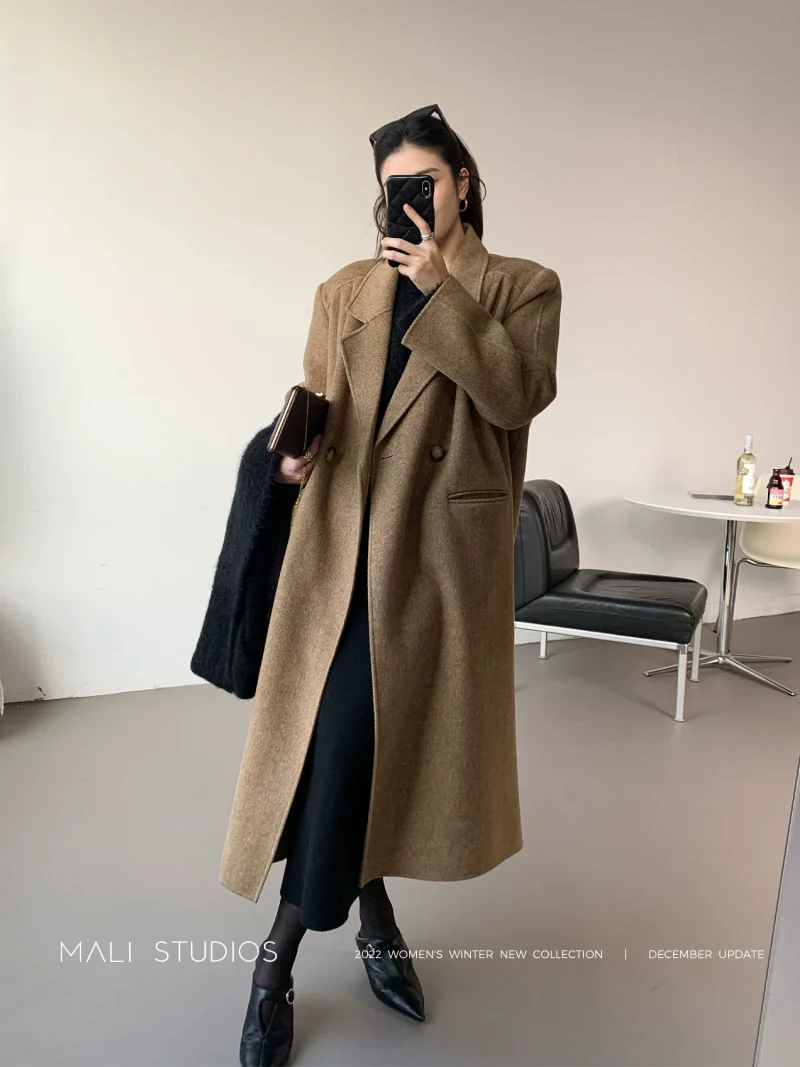 MALI|90年代VTG时髦宽肩_全羊毛双面呢压褶直身大衣