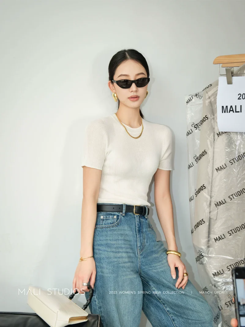 MALI2023春秋新款圆领紧身T恤经典微透打底衫内搭上衣